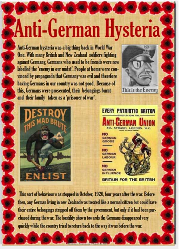 Some of our topics included; Germans living in New Zealand during WW1, children in NZ in WW1, nurses on the front, propaganda, conscription and NZ soldiers in WW1 to name a few. We got into pairs and chose a topic to create a poster on. We then researched in our pairs about our topic to gather all the information we needed to make our posters. In our pairs we worked online using programs such as Microsoft Word and Publisher to successfully create an informative, intriguing and visually appealing poster to send to France.